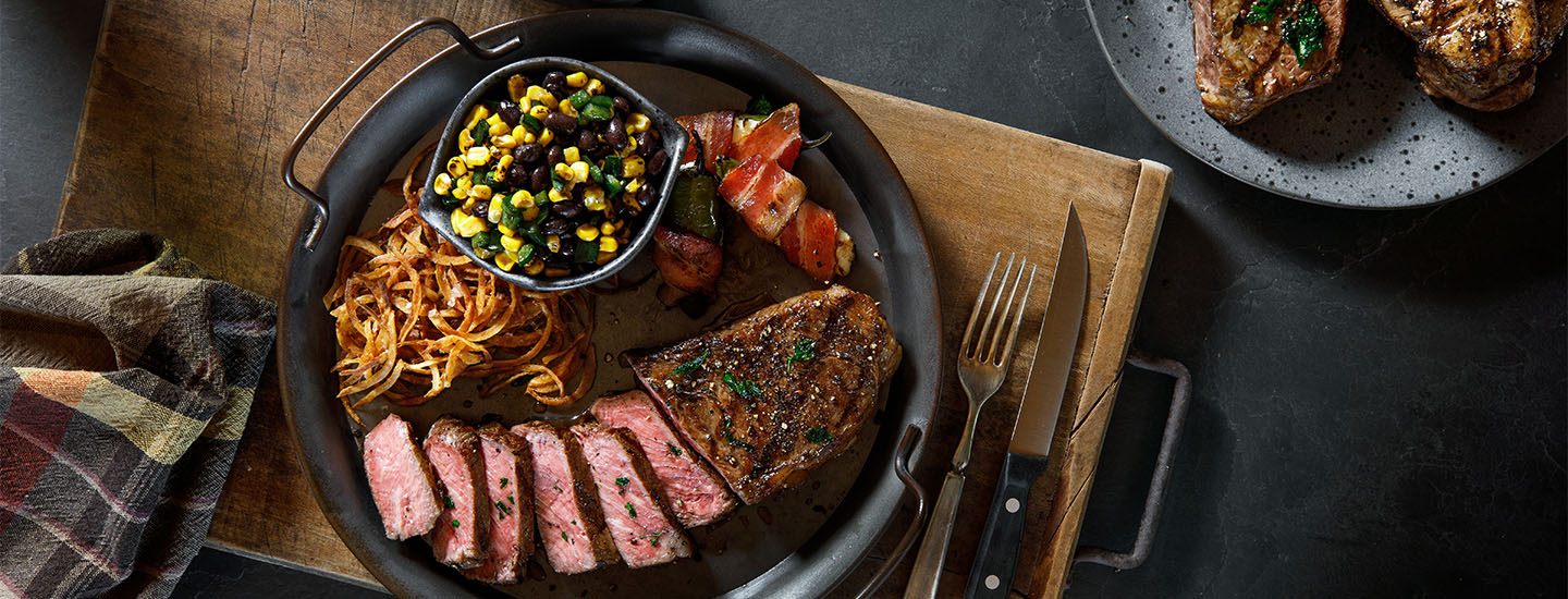 A steakhouse and ranch favorite alike, striploin steak, also known as a New York strip or simply a strip steak, is known for its rich flavor with a tender bite. Our Prime Striploin Steaks are cut only from USDA Prime graded beef and are USDA Certified Very Tender*. Cut to strict steakhouse specifications and aged for a minimum of 21 days, this steak ensures an unforgettable eating experience every time. With 71 grams of protein per package and best served at medium rare, our Prime Striploin is sure to impress the most discerning beef connoisseur.